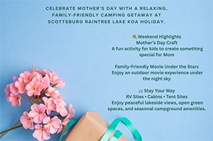 Celebrate Mother's Day Weekend at Scottsburg Raintree Lake KOA Holiday with a relaxing, family-friendly camping getaway starting Friday, May 8, through Sunday, May 10, 2026.